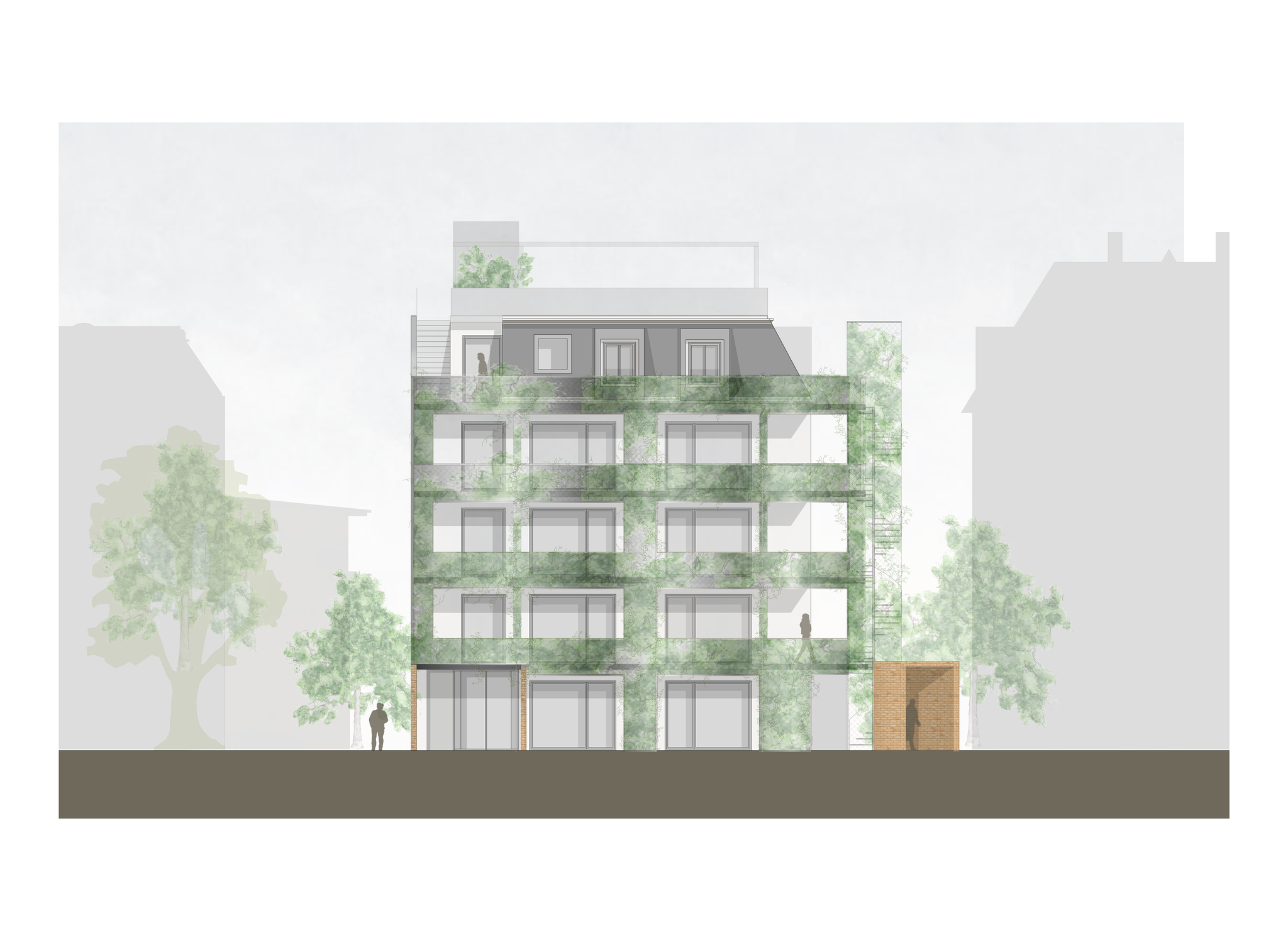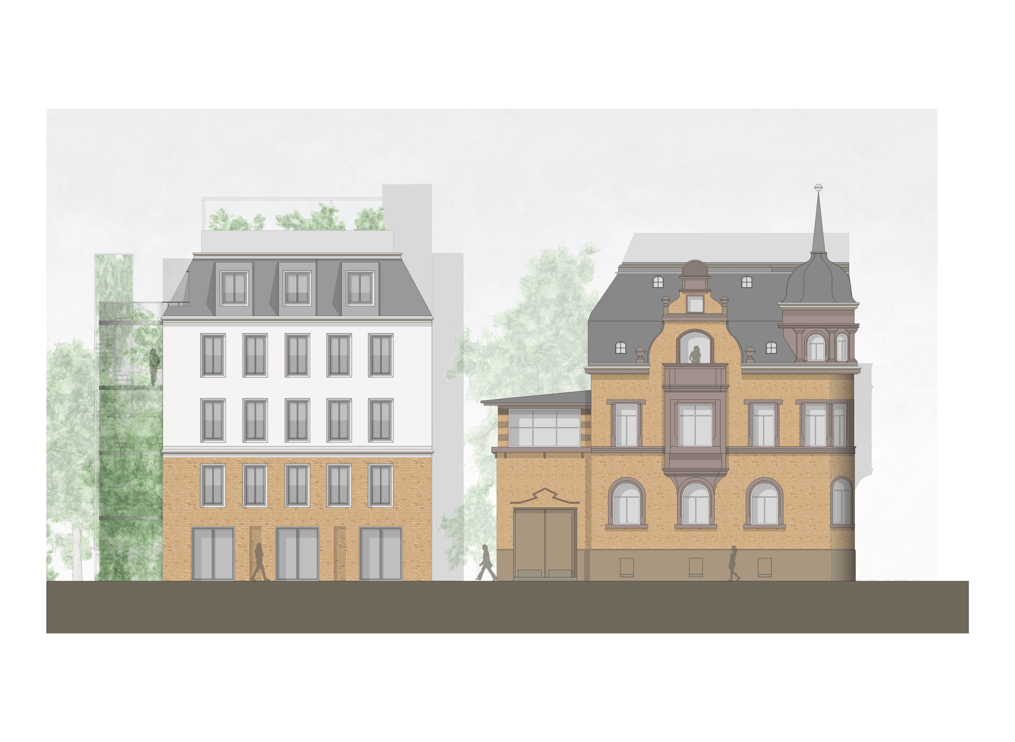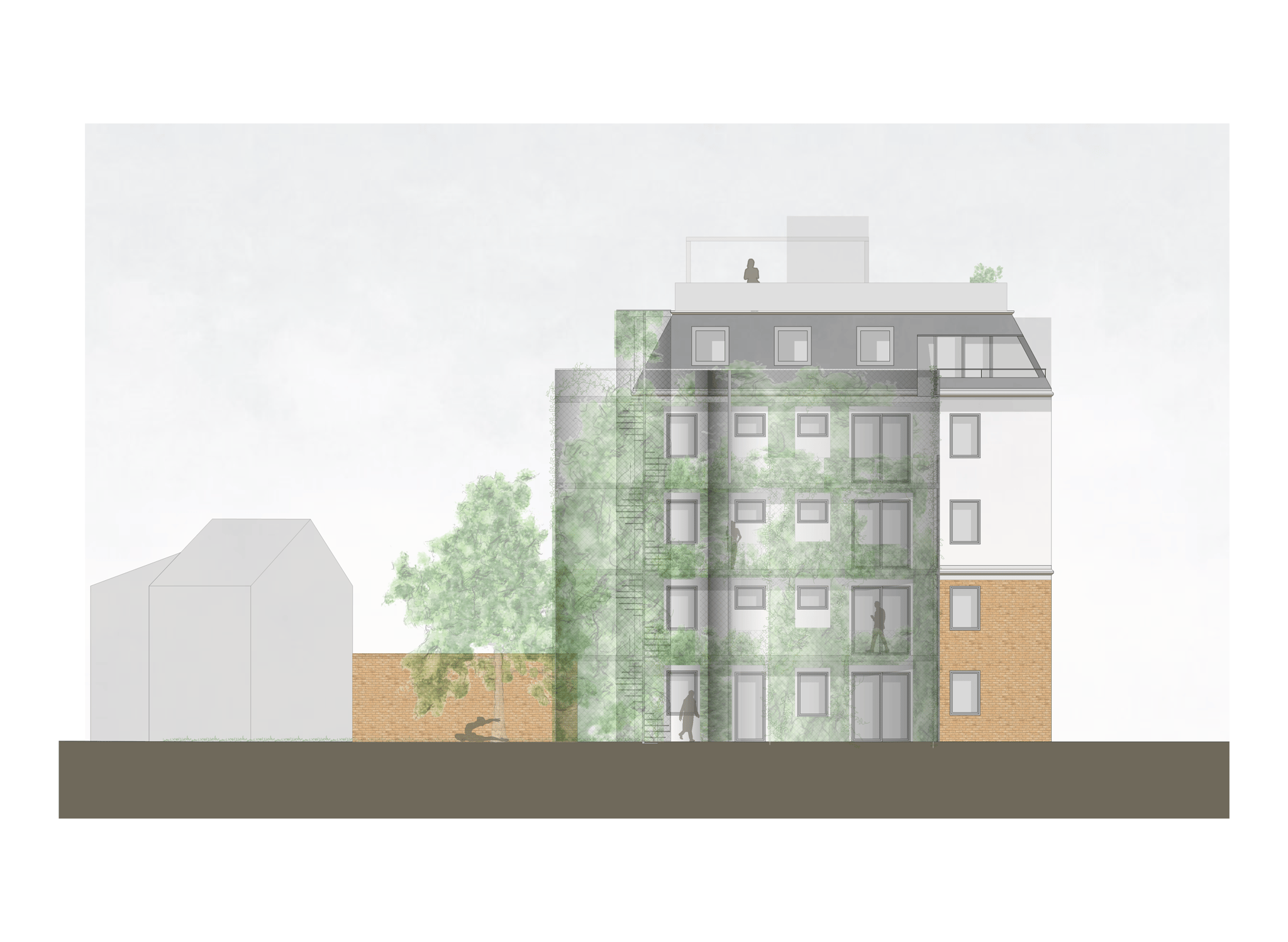 Das neu geplante Nachbargebäude nimmt in seiner Fassadengestaltung wichtige Aspekte der umliegenden Architektur in sich auf und verbindet diese mit einem modernen Stil. So schafft die Verklinkerung des unteren Gebäudeteils eine Symbiose zum historischen Kontext und wird ergänzt durch weißen Putz und einen begrünten Laubengang der die Nord-West-Ecke umarmt. Dieser dient zudem als zweite Erschließung und vertikale Anbindung der Wohnungen zum gemeinsamen Innenhof.