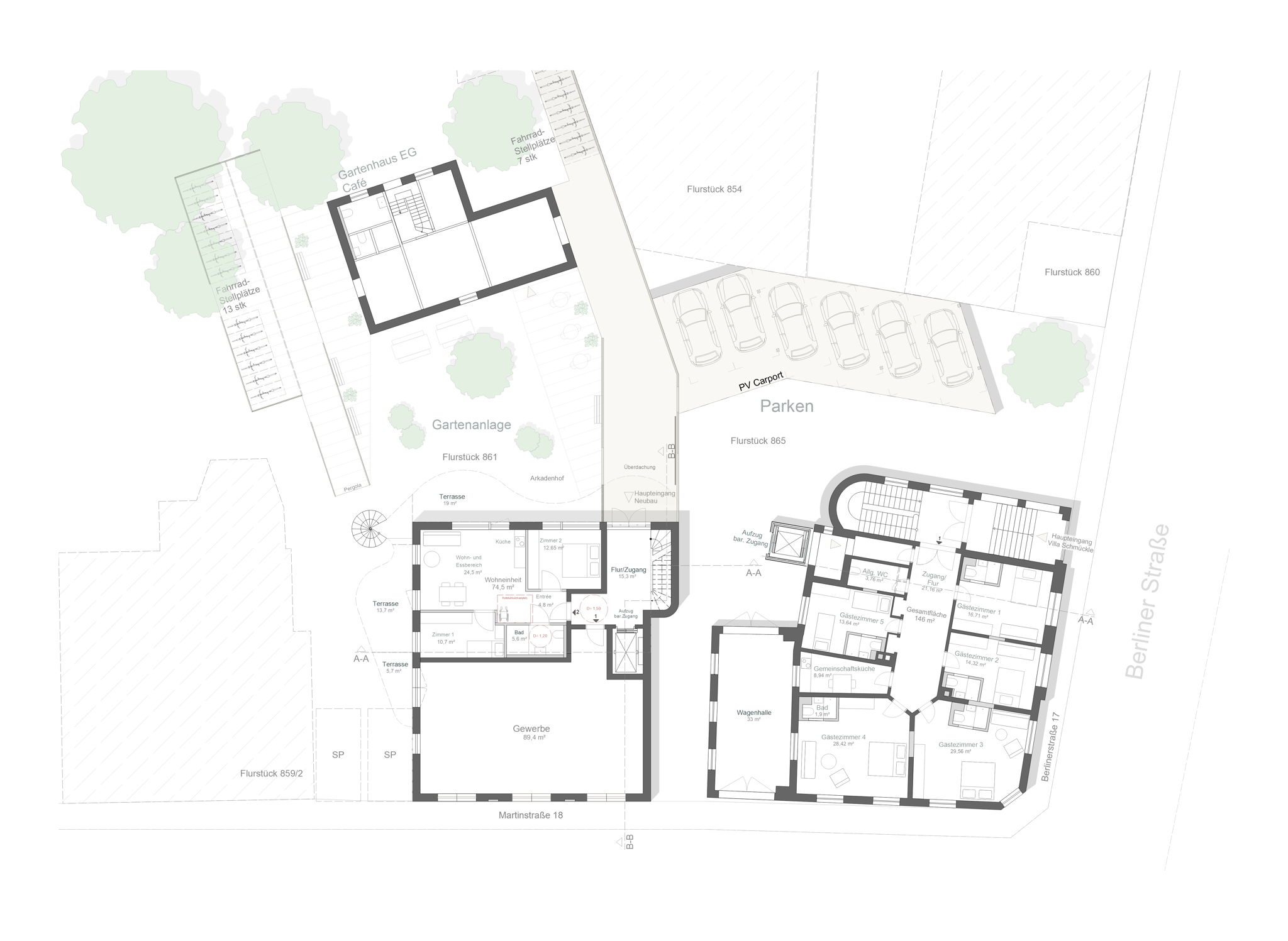 Gemeinsam bilden die beiden Gebäude ein Ensemble aus Alt und Neu, die mit einem Café im Innenhof, sowie weiteren Orten der Begegnung ein wertvolles Angebot zum gemeinschaftlichen Leben und Wohnen schaffen.